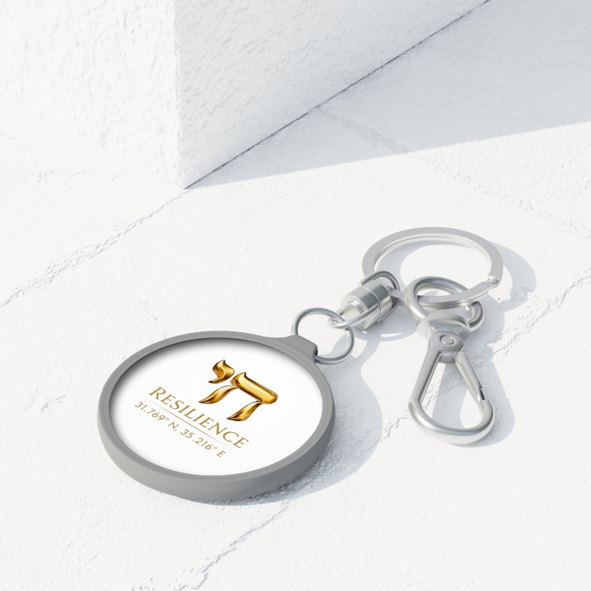The gold Chai (Life) symbol shines against a crisp, luminous backdrop, anchored by the precise coordinates of our heritage. This foundational piece is designed for those who lead with clarity and unyielding strength. Whether as a daily anchor for your keys or a statement on your bag, it is a manifest declaration that our light remains unbroken and ever-present."