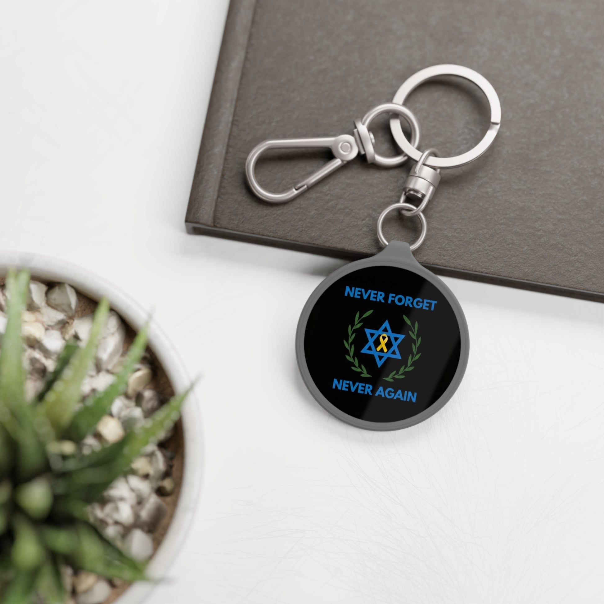 Bold, unshakable, and deeply symbolic — this Never Forget, Never Again Keyring is designed to carry memory with purpose. Set against a striking midnight black background, the Star of David framed by a laurel wreath stands for remembrance, unity, and enduring strength. Compact yet powerful, this keyring is more than an accessory — it’s a daily statement of resilience and resolve. Crafted to be durable and meaningful, it keeps history close and values closer, wherever life takes you.