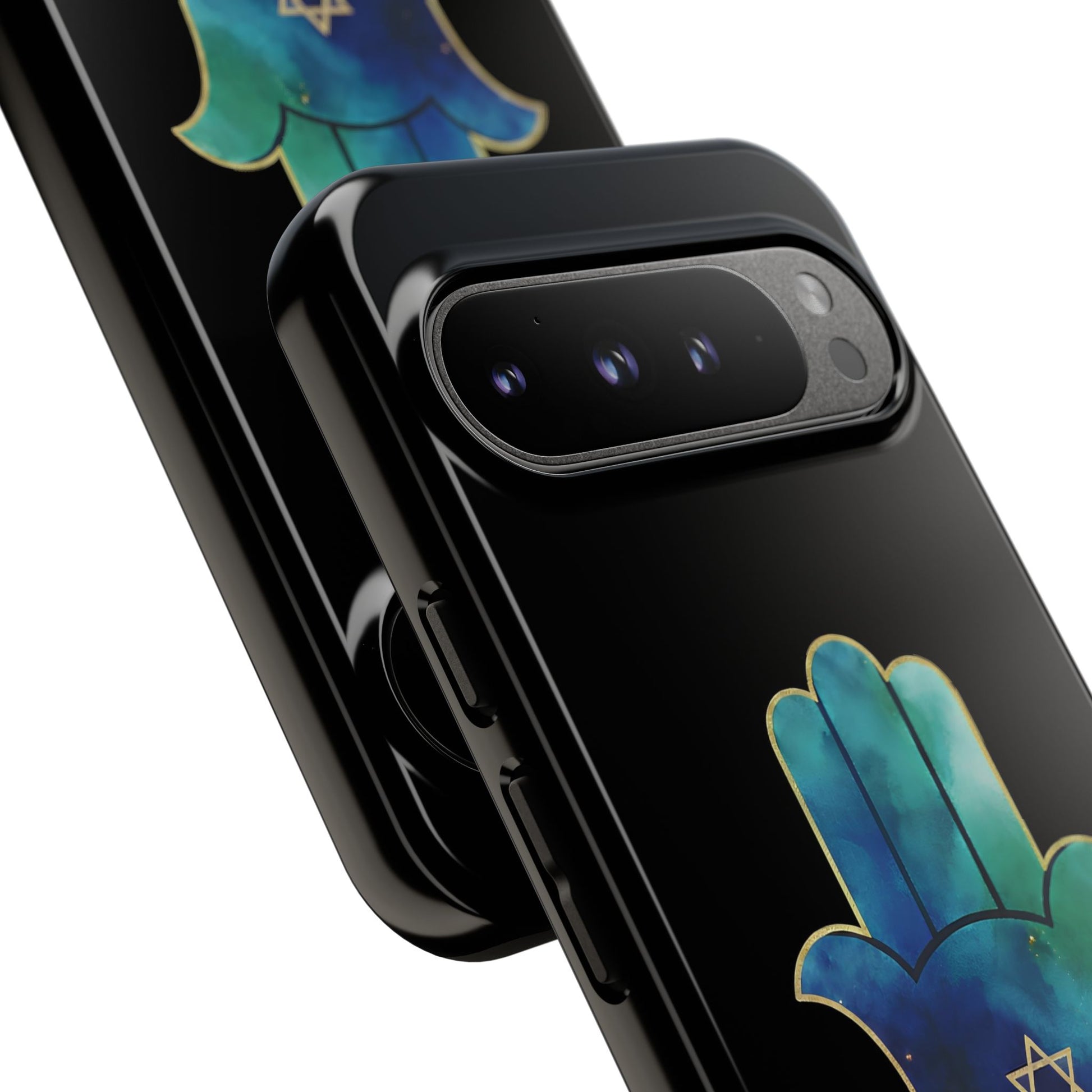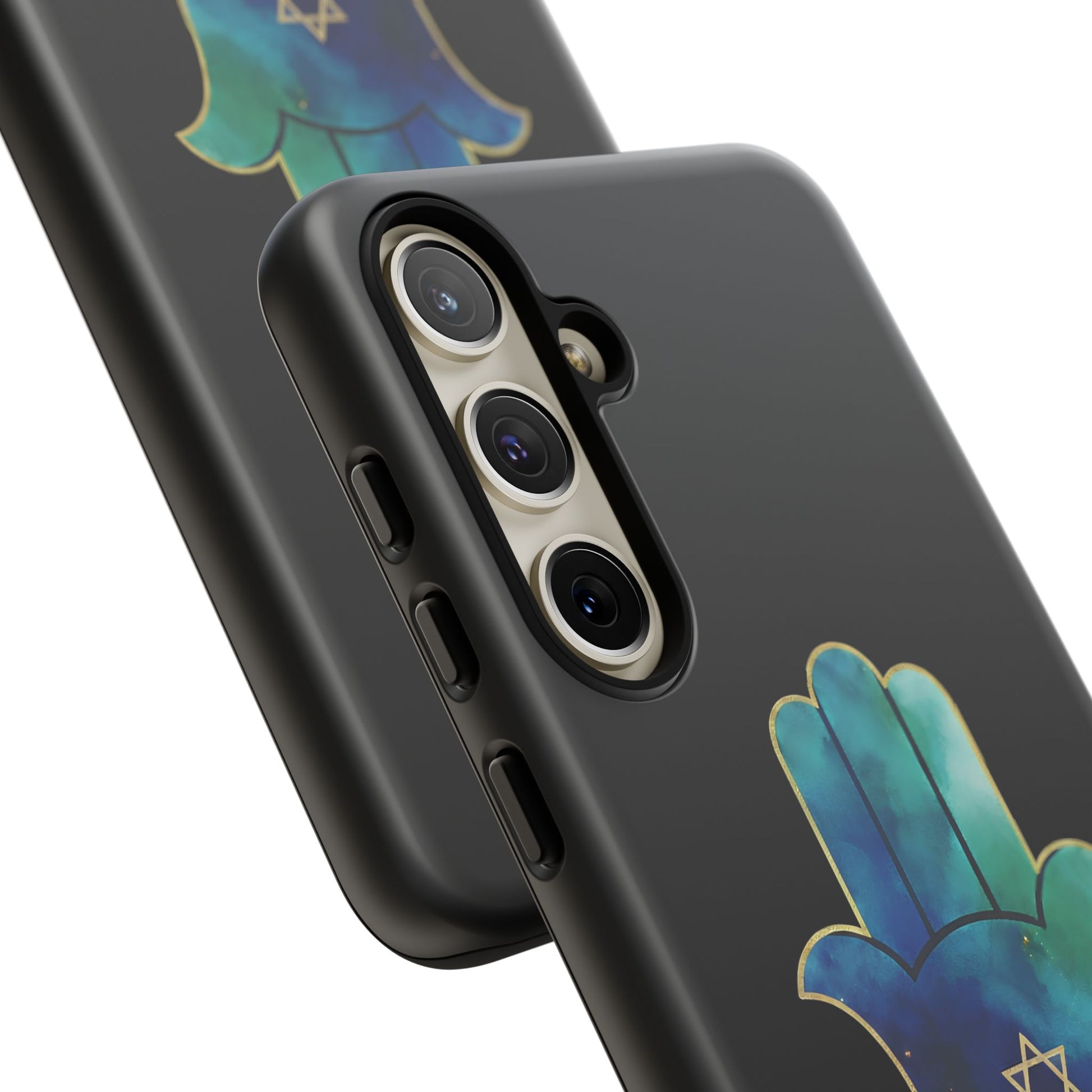 The Protection & Peace design featuring the Hamsa an ancient symbol of divine protection, strength and calm paired with the star of David, representing faith, unity and resilience. The flowing blue and teal tones evoke serenity, balance, and emotional grounding, while the gold detailing adds a sense of sacred beauty and quiet power.