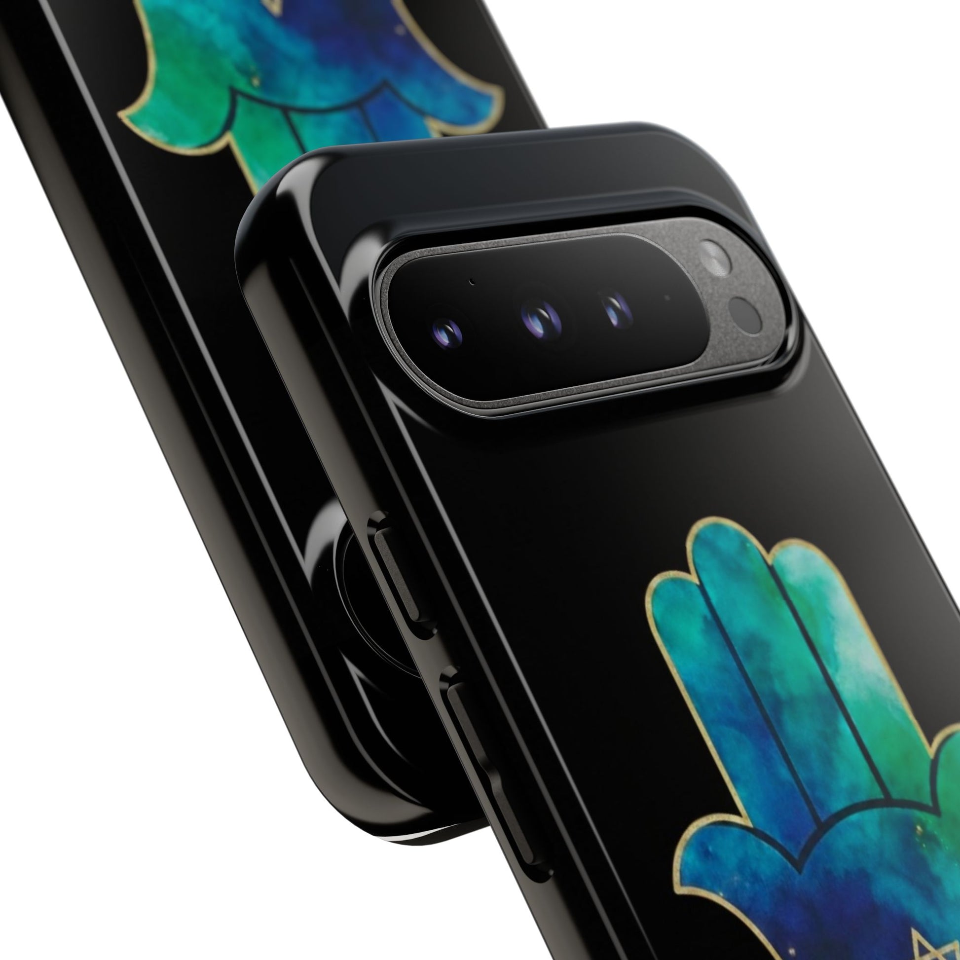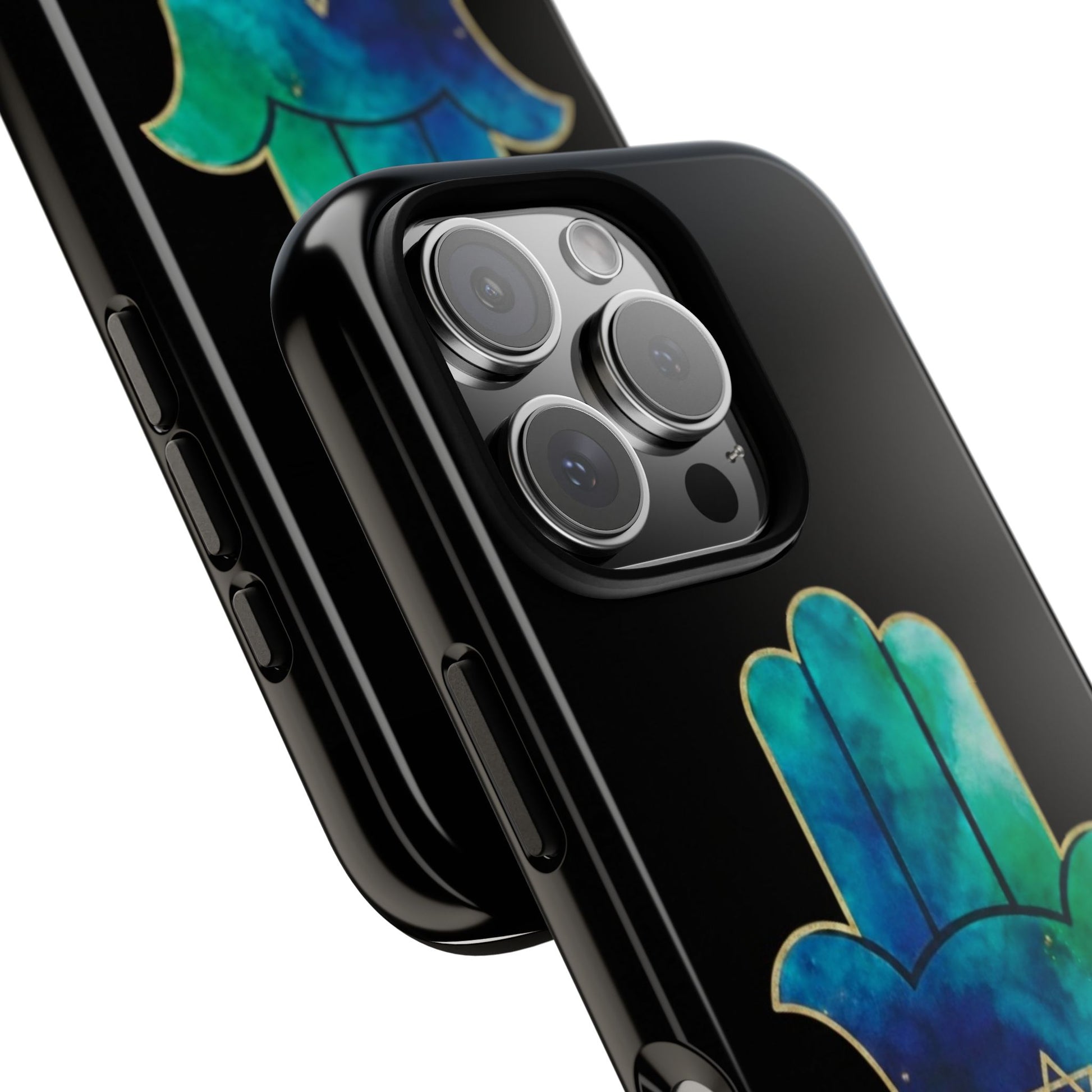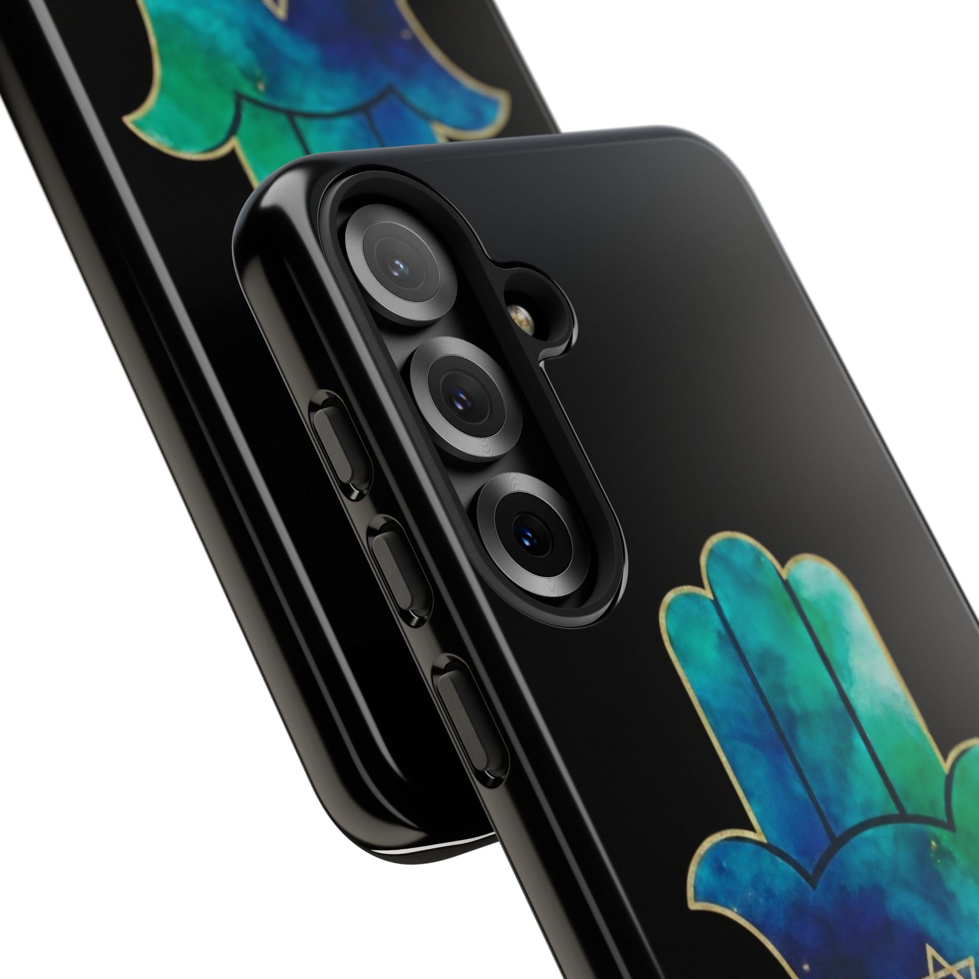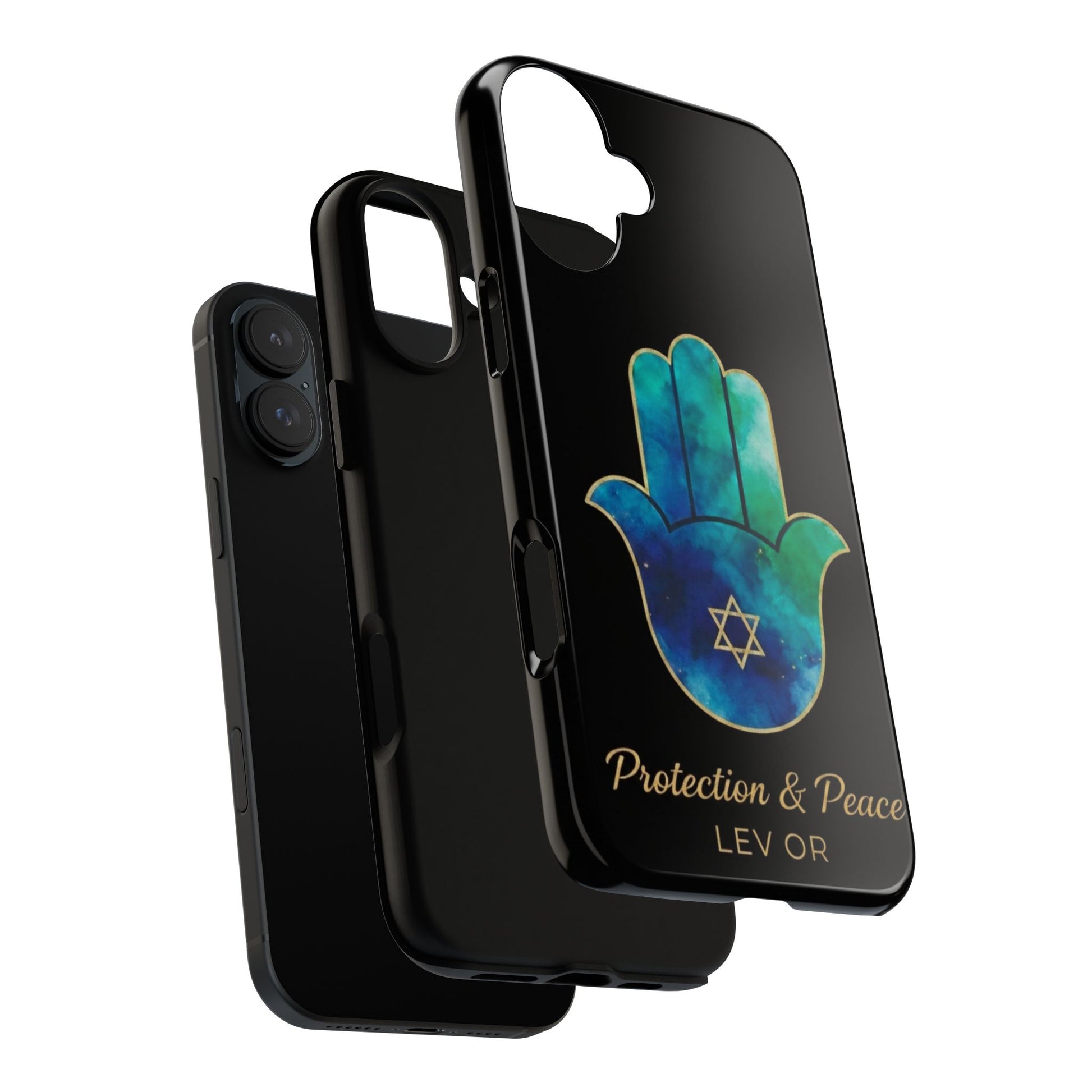 The Protection & Peace design featuring the Hamsa an ancient symbol of divine protection, strength and calm paired with the star of David, representing faith, unity and resilience. The flowing blue and teal tones evoke serenity, balance, and emotional grounding, while the gold detailing adds a sense of sacred beauty and quiet power.