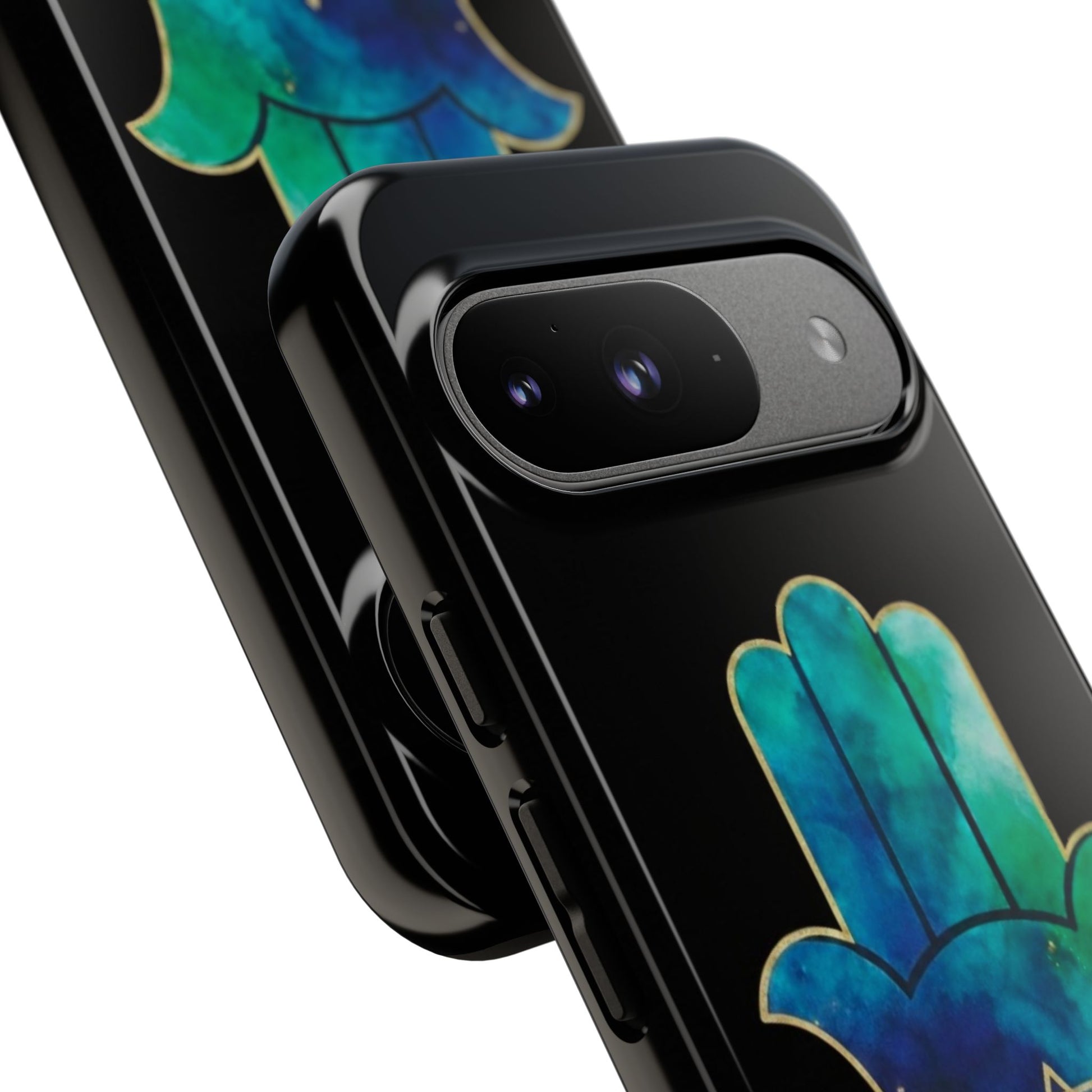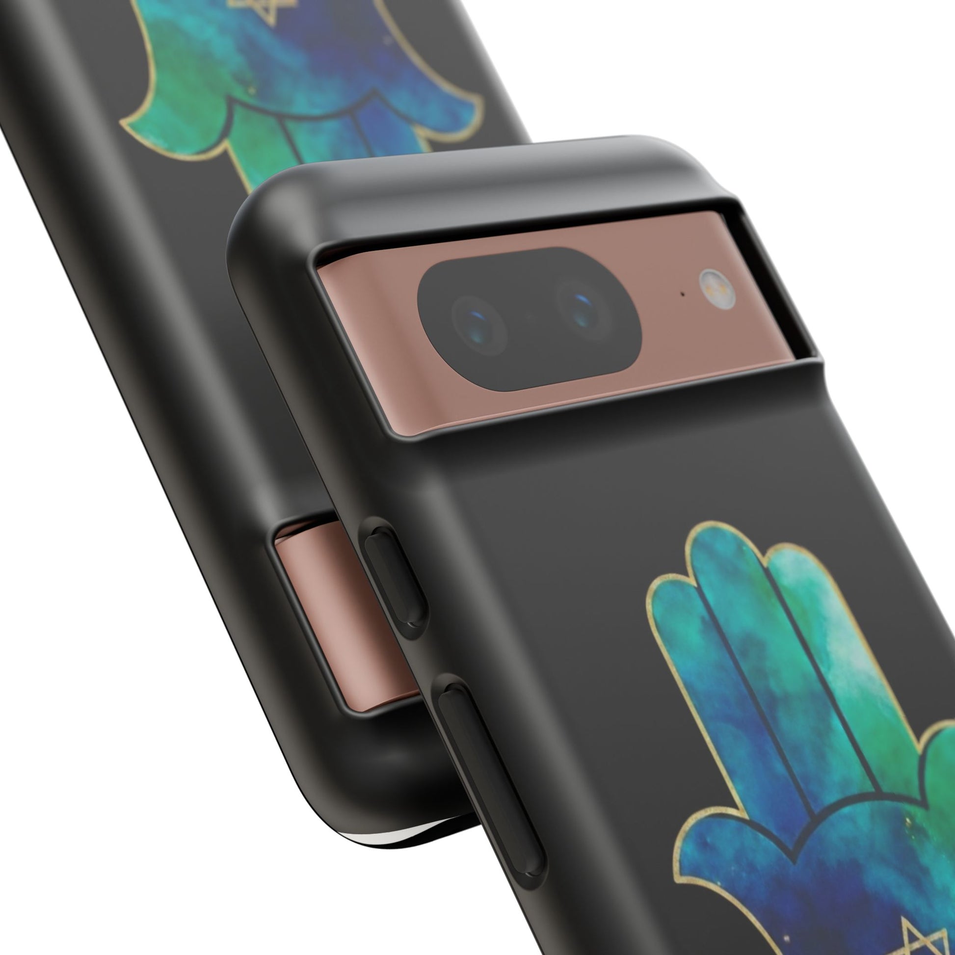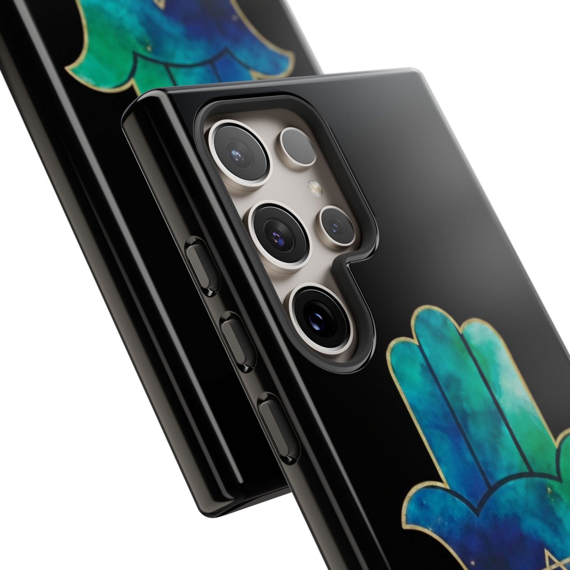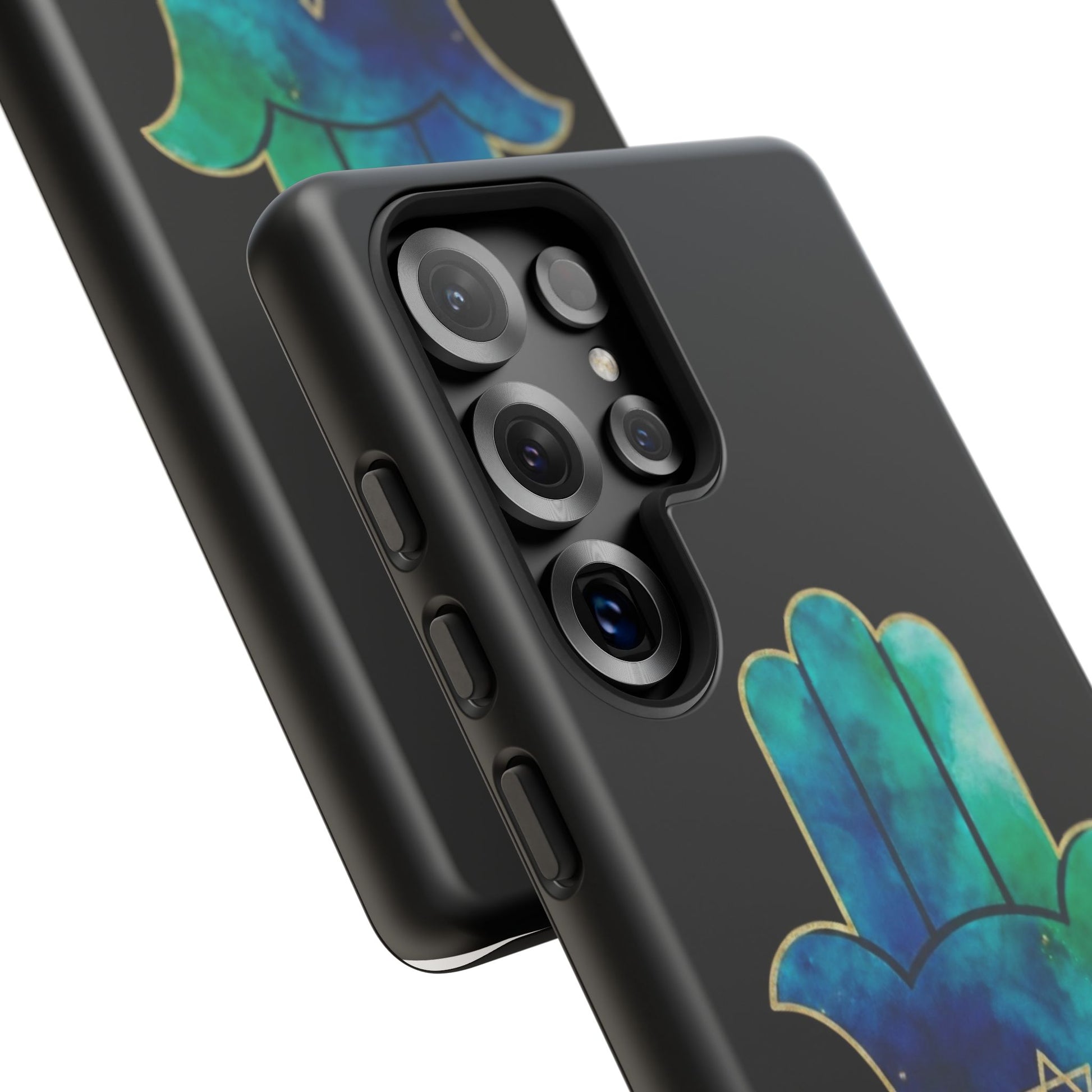 The Protection & Peace design featuring the Hamsa an ancient symbol of divine protection, strength and calm paired with the star of David, representing faith, unity and resilience. The flowing blue and teal tones evoke serenity, balance, and emotional grounding, while the gold detailing adds a sense of sacred beauty and quiet power.