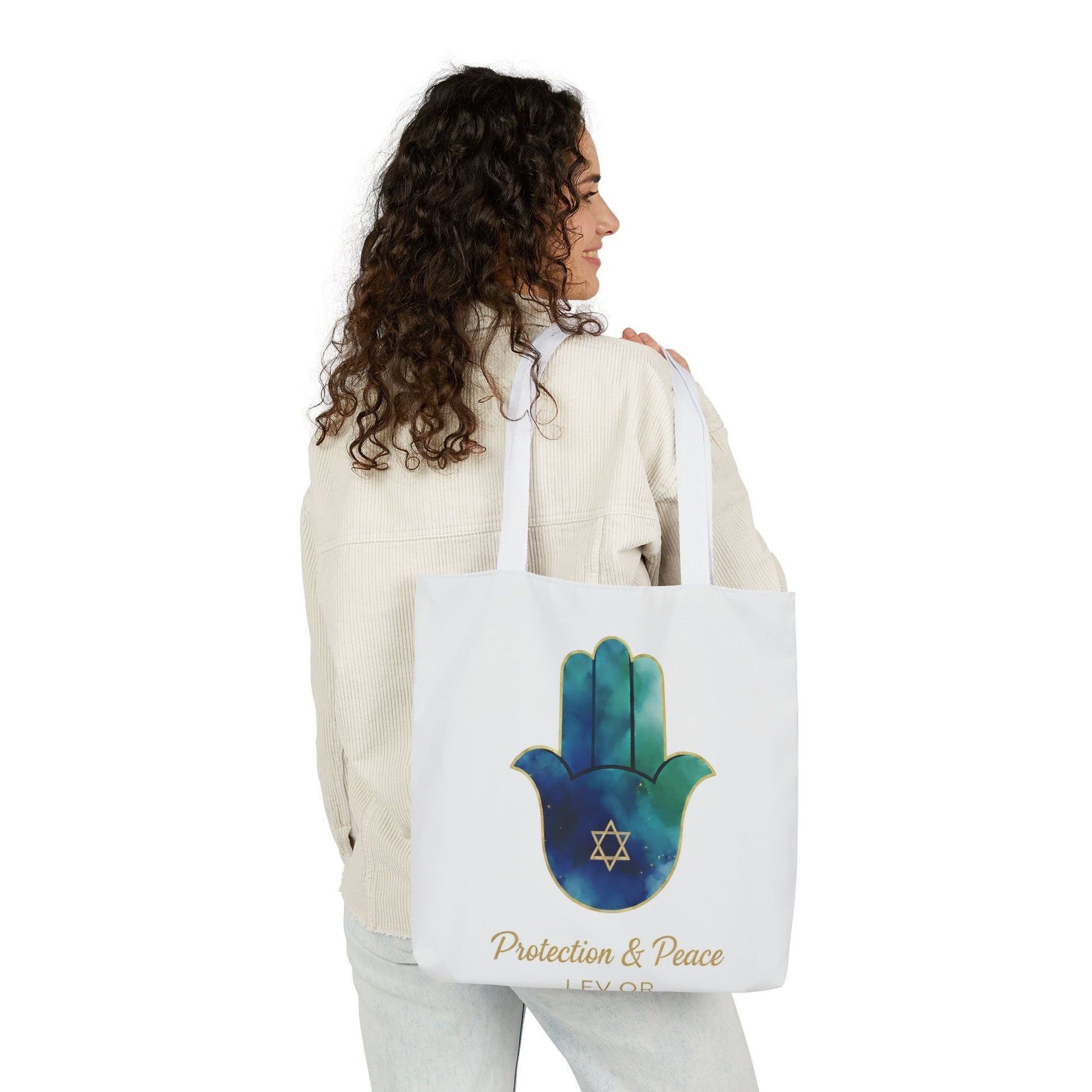 Against a backdrop of pristine white, the Guardian Tote centers on the sacred intersection of the Hamsa and the star of David. The gold-etched star serves as a radiant anchor of identity, while the emerald and blue watercolor tones provide a sharp and sophisticated contrast that demands attention through it's clarity. With One versatile size 18 x 18 with three premium strap options black, white and beige.