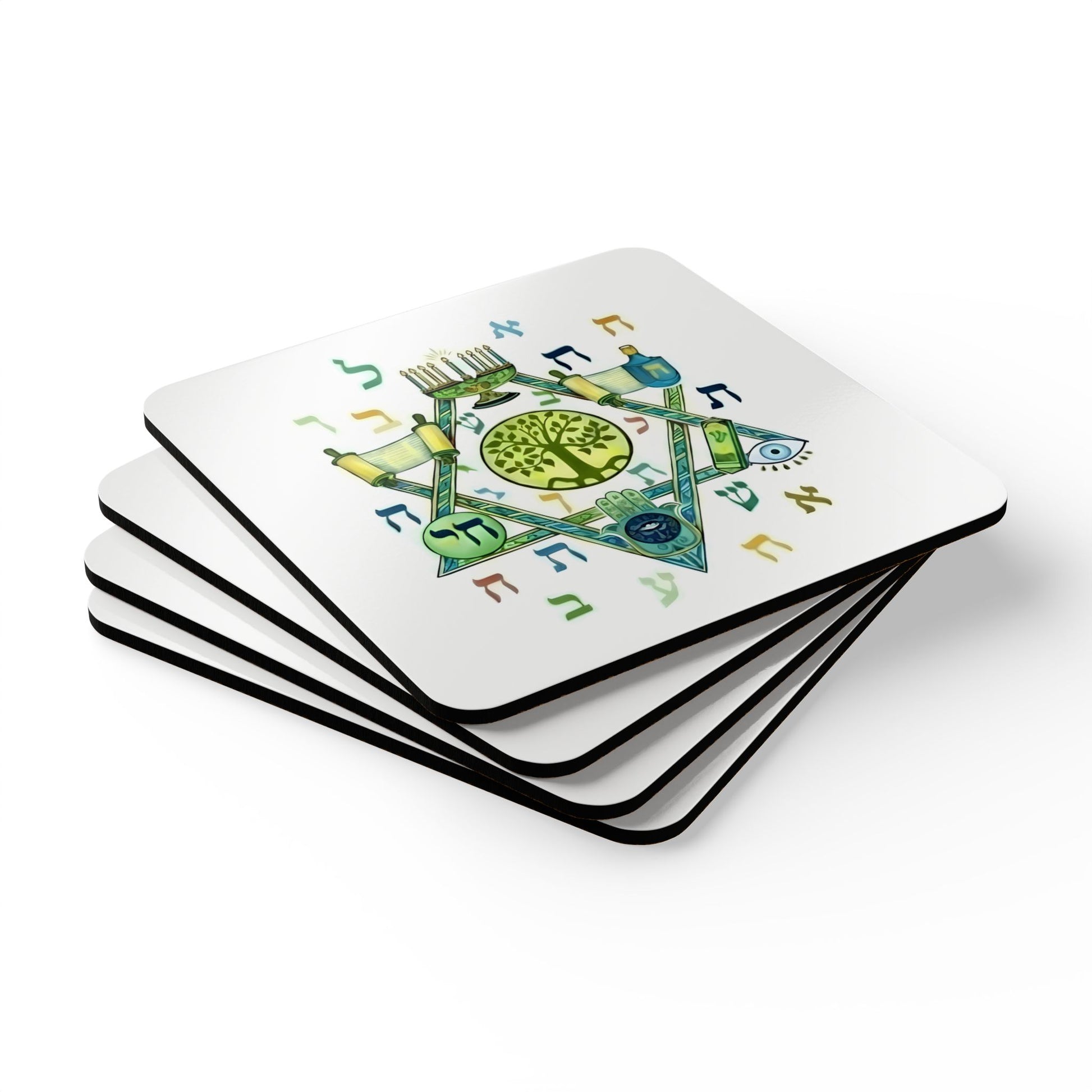 The Covenant Collection White Edition is a masterclass in minimalist luxury. This incredible statement piece features a set of four coasters where every sacred symbol of the Jewish faith—the Menorah, the Hamsa, the Chai, and the Torah—is meticulously integrated within the points of the Star of David. Against a gallery-white background, this design represents a "Star of Strengths," offering a clean and modern way to honor an eternal legacy.
